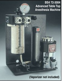 The Advanced Table Top Anesthesia machine is a compact table top version of the Vaporstick Plus, see page F17. The unit may be easily moved from room-to-room or with the optional bracket, BS4 72-3015, mounted on the wall. The lightweight design and compact size,L x W x H, 12 x 8 x 17 inches, allows the unit to be placed in areas where space is a premium.
