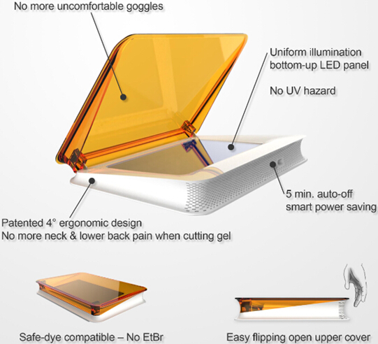 · 人體工學專利設計 -- 全世界第一臺人體工學設計(4°角)之電泳凝膠成像儀,看凝膠片更輕松,切膠片時不再頸痠背痛。